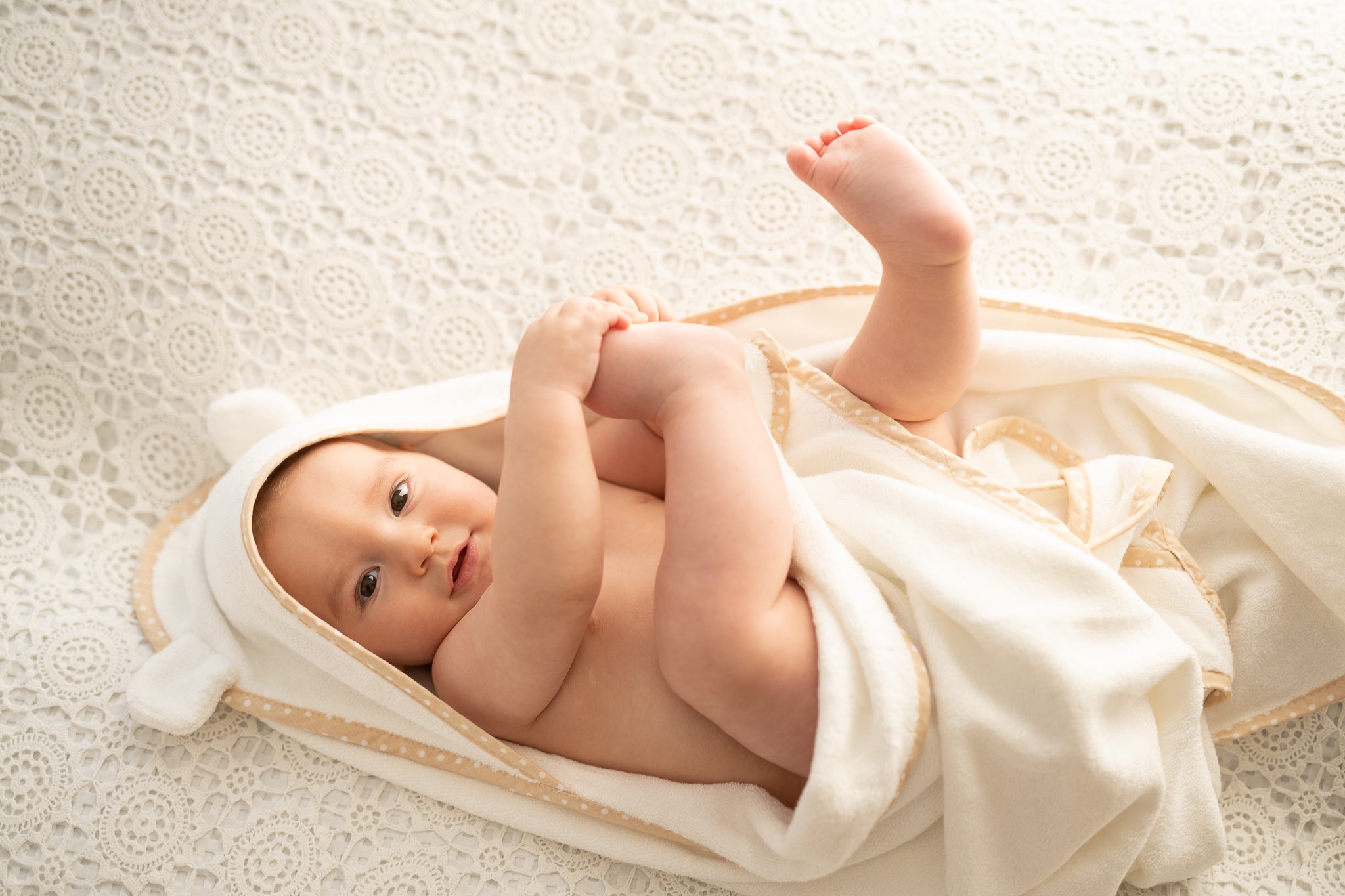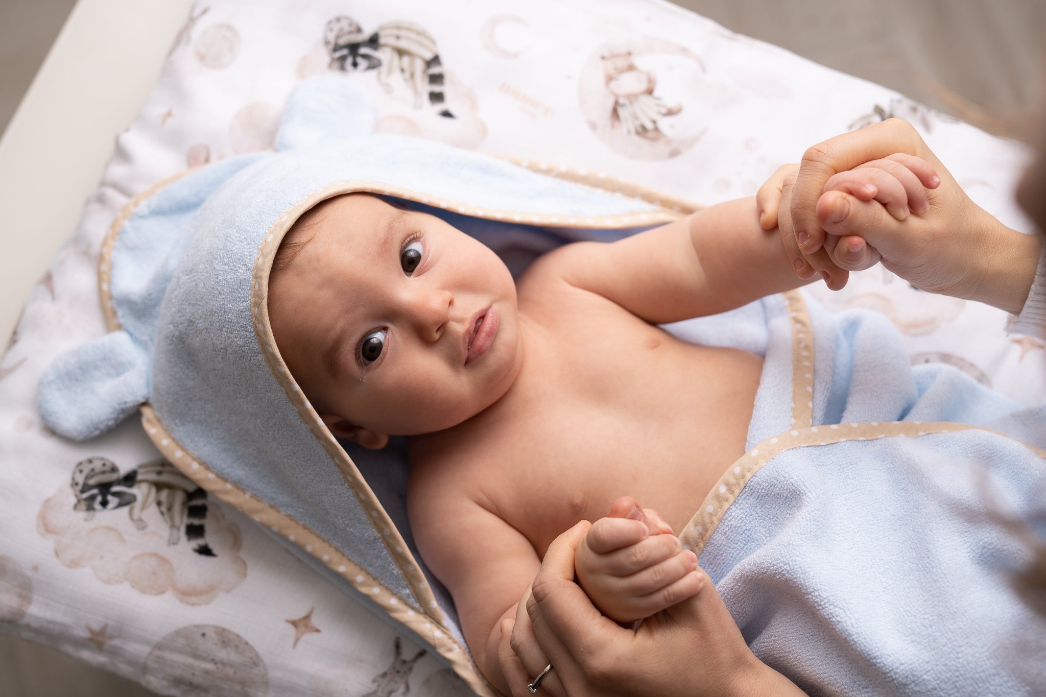 La sua misura avvolge perfettamente il neonato, offrendo un senso di sicurezza e calore che rende il momento del bagnetto speciale. Questo asciugamano cresce insieme al bambino, regalando al genitore la possibilità di avvolgerlo in un abbraccio morbido e confortevole ogni volta.